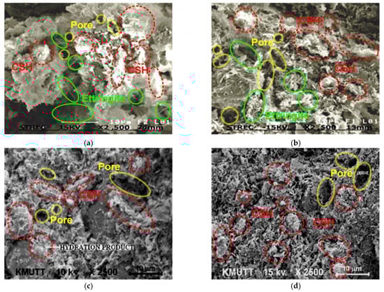 Figure 11, Figure 12 and Figure 13 show the microstructure of cement–BA-admixed clays at wr = 130% and C = 15% with different BA contents (10 and 30%) and sizes (BA-F and BA-C). At an early age (7 days) for all considered cement–BA-admixed clays (Figure 11a, Figure 12a and Figure 13a), there are small amount of products introduced by the hydration reaction (CSH and CASH), similar to results of cement-admixed clays without BA as described above. However, for cement–BA-admixed clays, it indicated the particles of cement and BA filled in more voids and also surrounded the clay particles. Consequently, this causes the voids of cement–BA-admixed clays to decrease. Thus, it is one reason to explain why the increased strength of cement–BA-admixed clays is minimal at the initial time (see Figure 3a,b).