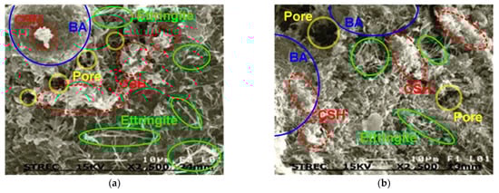 SEM analysis results (2500 times magnification) of cement-admixed clay blending with BA-C at wr = 130%, C = 15%, and Bc = 30% for different tc: (a) tc = 7 days; and (b) tc = 28 days (dash-red line = CSH, solid-green line = ettringite, double solid-yellow line = pore, and solid-blue line = BA).