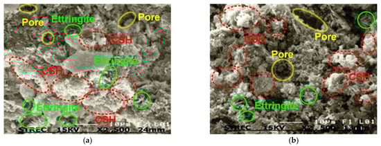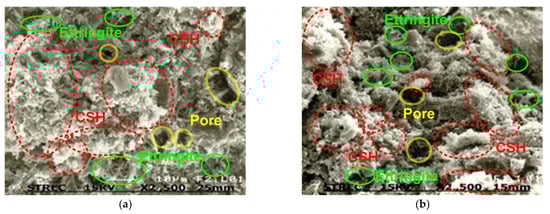 SEM analysis results (2500 times magnification) of cement-admixed clay blending with BA-F at wr = 130%, C = 15%, and Bc = 30% for different tc: (a) tc = 7 days; and (b) tc = 28 days (dash-red line = CSH, solid-green line = ettringite, and double solid-yellow line = pore).