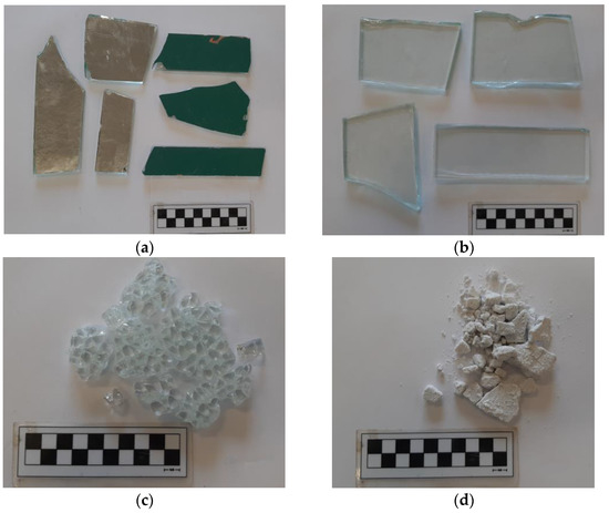 Types of glass waste tested (a) mirror, (b) monolithic, (c) tempered, (d) sediment.