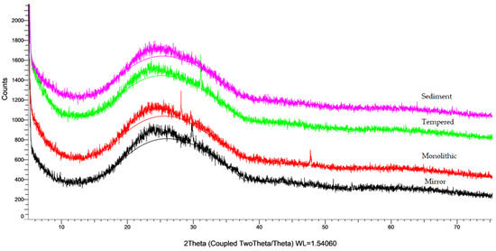 The chemical composition of the four different types of glass under 75 μm (mirror, monolithic, tempered and sediment), measured by AAS, is presented in Table 3. The soluble salts content is given in Table 4, and Table 5 shows the density and pH values of the glass cullet. The mineralogy of the materials is presented in Figure 2.