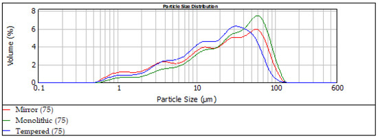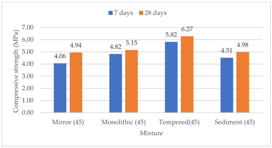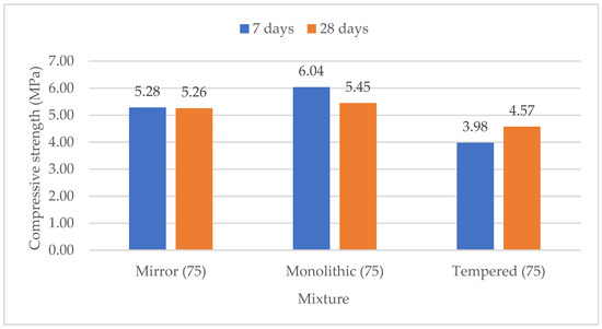 The pozzolanicity index, tested according to ASTM C593 [26], is given in Figure 9 for the glass waste under 75 μm. The Mirror and Monolithic mixtures seem to have similar behavior with respect to the compression, varying between 5.26–5.45 MPa at 28 days, which is above the limit set by the standard (4.1 MPa). The Tempered mixture (75) had a lower performance, with 4.57 MPa at 28 days. On the other hand, the compression remains at the same levels as it was for the glass under 45μm (4.94–6.27 MPa) (Figure 10). The higher water demand of these mixtures could potentially have affected the results. In general, waste glass binders can be considered to have moderate pozzolanic behavior; however, further grinding of the material could improve their reactivity.