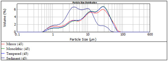 The particle size distribution of the binders is given in Figure 3 and Figure 4. The samples were grinded in two different fineness, under 75 μm and 45 μm. The samples seem to have similar distributions of particles, with the exception of sediment (45), which is finer than the other binders.