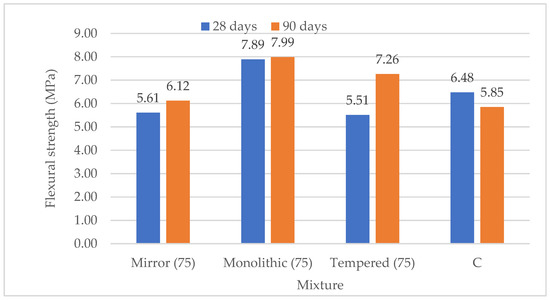 The results of the binders under 75 μm are presented in Figure 5 and Figure 6. Mixture C is the reference cement mortar according to EN 196-1 [24]. It could be claimed that the addition of waste glass retains, or even improves, the flexure strength of the mortars. The monolithic waste glass showed the highest strength results, reaching 7.89 MPa at 28 days.