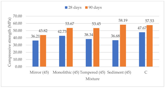 The results under flexure, shown in Figure 7, are similar, or even better, than the ones of the reference C mortar. Moreover, grinding the material under 45 μm seems to improve the compressive strength of the mixtures (Figure 8). In this case, the Mirror glass mixture shows 75.95% of the reference mortar’s 28d strength (C), while the Monolithic and Tempered mixtures show 89.63% and 80.42%, respectively, at 28 days. The mixture with Sediment glass reaches 76.96% of the C mixture’s strength. At 90 days, the compression is over 90% for all of the glass mixtures, with the exception of the Mirror glass mixture.