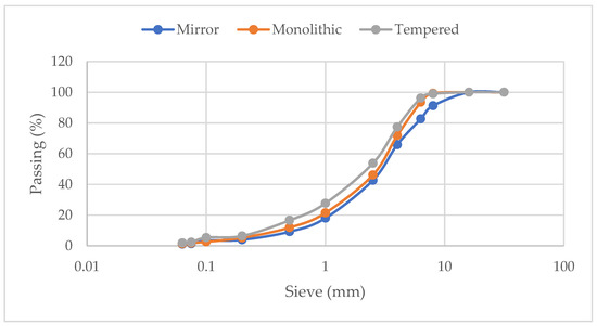 Three of the four types of waste glass (mirror, monolithic and tempered) were tested as supplementary aggregates (the fourth was in dusty form). The samples were crushed and sieved and their granulometry is shown in Figure 11. All of the samples have 0–8 mm particles, but it should be mentioned that higher granulometries with particles larger than 8 mm were not preferred due to their flakiness, which would affect the mechanical behavior when used in mortars [36]. The flakiness and shape indexes for the aggregates is presented in Table 6. The Mirror glass aggregates had the highest values, as the flakiness index was 26.39% and shape was 27.44%. This means that mirror glass particles have a more elongated shape, which could be explained by the coating of silver used in the production of mirrors to hold the particles together and prevent them from breaking easily. The Monolithic glass aggregates follow, with flakiness of around 19.81% and shape 14.35%. The lowest values are for the Tempered glass aggregates, with 18.09% flakiness and 13.22% shape index; this can be explained as, during its production stage, the material is processed to improve its mechanical performance, and is broken in small rectangular pieces for safety reasons.