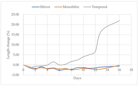 The alkali-silica reaction is perhaps the most important factor when it comes to the use of recycled aggregates in concrete. Glass aggregates, due to their contents of silica, have a higher risk of reacting with the alkalis of cement. To investigate their performance, cement mortars containing the tested aggregates were produced, immersed in a sodium hydroxide solution and kept in an oven at 80 °C. During the test, the specimens’ length was recorded, and their length change is depicted in Figure 12. The Mirror and Monolithic mortars presented shrinkage up to 16 days of testing, while the Tempered mixture was the only one to reach an expansion of 25% at 16 days. This means that the Tempered glass is more reactive, and this could be attributed to its chemical composition. Although there are small differences with the Mirror and Monolithic glasses, the Tempered glass has the higher contents in SiO2 (75.81%), Na2O (9.14%) and CaO (11.50%). Moreover, the sample has the highest percentage of reactive CaO (10.22%) and amorphous silicon content (85.7%).