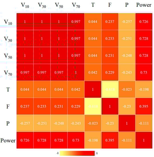 The research data in this paper come from a wind farm in East China, including wind speeds of 10 m, 30 m, 50 m, and 70 m above the ground, atmospheric temperature, humidity, pressure, and other meteorological data. The computer side of the wind turbine performs data acquisition steps of 15 min. Since all wind turbines have yaw devices to adjust their orientation according to wind direction automatically, this paper does not consider the effect of wind direction on wind power. To determine the input variable of the wind power prediction model, this paper uses the correlation coefficient ρ to analyze the correlation between wind speed, atmospheric pressure, air humidity, and other meteorological factors and wind power. The greater the value of ρ, the stronger the correlation between the input variable and wind power, and the greater the influence of the input variable on wind power. The correlation coefficient ρ is defined as: