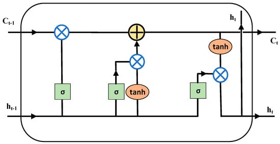 The LSTM model can solve the problems of gradient explosion, gradient disappearance, and the inability to preserve historical information in the long time series training process of the cyclic neural network (RNN). The LSTM model can provide better prediction performance in more comprehensive historical data than traditional cyclic neural networks. The interior of the LSTM consists of three unique gate structures and a status module for storing memories [23]. The cell structure of the LSTM is shown in Figure 5.
