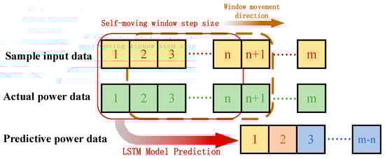 The SWLSTM model proposed in this paper is based on the traditional LSTM model. By setting the step size of the self-moving window, the training and prediction of the conventional LSTM model are changed to the gradual forecast along with the window movement. The prediction process of the SWLSTM model is shown in Figure 6. Determine the data length in a window by creating a self-moving window and setting its step size. Then, it was put into the LSTM model, the characteristics of the input data were extracted, the relationship between input meteorological element data and power data was trained, and the prediction model was established. Conclusively, realize the prediction of the following step data. The control window moves to the right step by step to complete the projection of power data and a perfect prediction model network is obtained. Compared with the traditional LSTM model, SWLSTM can shorten the length of the initial training step to extract more feature information and retain the data features more clearly. Therefore, the PSO-SWLSTM model can improve the prediction accuracy of wind power.