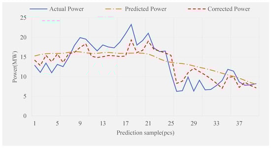 Figure 12 shows the prediction and correction data of the model proposed in this paper. The predicted data is the expected power obtained after sample correction by affine optimization model data after PSO-LSTM model training. The updated power data are the corrected data obtained after the prediction error is introduced into the EFCM-LSTM model. As seen from the figure, the model-predicted power data before correction cannot clearly show the trend and fluctuation of the actual power. After modification, the movement and change of true power can be reflected.