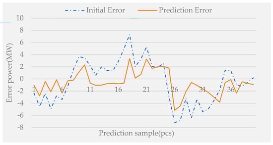 A group of data were used to train the PSO-SWLSTM model. Meteorological factors and power data were input into the PSO-SWLSTM model as input data for extracting feature information and establishing a prediction network. The output data were the predicted value of the power data, and the root means square error RMSE of predicted power and actual power was calculated. The model parameters of PSO-LSTM are consistent with those in Section 3.2. Group B’s meteorological factors and power data are brought into the prediction network trained by group A data as input data. The predicted power data of group B data are obtained, and the difference between the expected power data of group B and the actual power data is calculated as the initial error data. The meteorological factor data and error data of group B data were input into the LSTM model as input data to establish the error prediction network. The relevant parameters of the LSTM model are set as follows: the training cycle is 400, the learning rate is 0.001, and the number of hidden units is 16. Group C, as the test group, inputs the meteorological factor data and power data into the network of group A to obtain the preliminary forecast power and calculate the original error data. Then, input the error data and meteorological data into the web of group B to obtain the forecast error data, and finally, calculate the corrected power data with the preliminary forecast power data.
