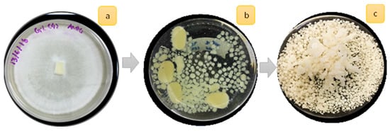 Figure 1. Preparation of GLMP. (a) Mycelium on agar plate after day 10. (b) First seed production. (c) Second seed production at day 10.