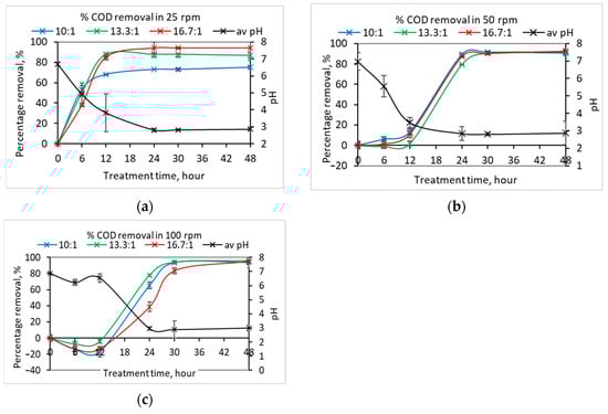 Figure 3. Graph of percentage removal (±standard deviation) of COD for the sample C10N1, C13.3N1 and C16.7N1 at (a) 25 rpm, (b) 50 rpm, and (c) 100 rpm.