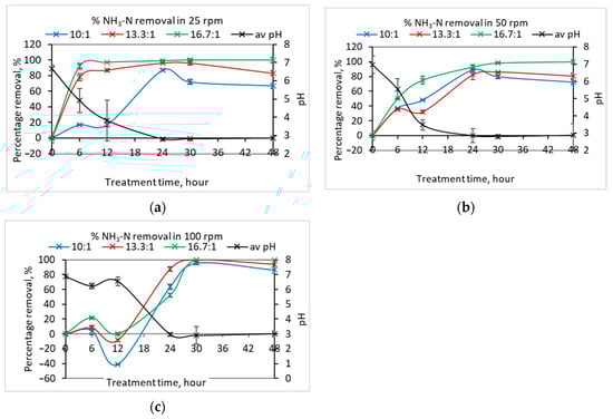 Figure 4. Graph of percentage removal (±standard deviation) of NH3-N for the sample C10N1, C13.3N1 and C16.7N1 at (a) 25 rpm, (b) 50 rpm, and (c) 100 rpm.