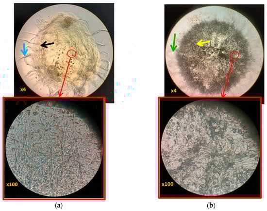 Figure 5. Image under light microscope (LM) x4 and x100 magnification (a) before treatment—black arrow show transparent pellet and blue arrow show regular hairy hyphae and; (b) after treatment with initial C16.7N1—yellow arrow darker colour of pellet body and green arrow show hyphae less visible.
