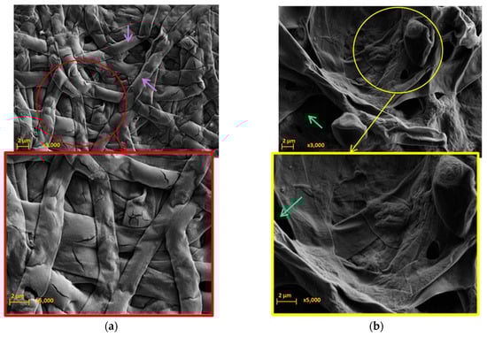 Micro-observation of the pellet before treatment (Figure 6a) showed a compact and dense hyphae tip network agglomerate, indicating that healthy pellets with network space structure also pack together, and a regular shape of hyphae tip network (purple arrow). The network space structure shows a porous irregular surface, shown by the green arrow. The irregular shape of the hyphae tip network formed indicates the effect of the nutrient having been uptake by the pellet after treatment with the synthetic wastewater. After the treatment, the hyphae tip network shrank, and the link was less compact on the pellet surface.