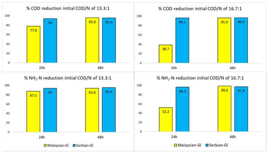 A comparison of current work on Malaysian G. lucidum was made with the previous work done on Serbian G. lucidum treating synthetic domestic wastewater by [21]. Two concentrations of synthetic wastewater of COD/N 13.3:1 and 16.7:1 in 100 rpm with treatment times of 24 h and 48 h were taken for the purpose of discussion. The difference from the previous work was in the initial pH of the synthetic wastewater prepared before starting the treatment, which was pH 6.5 to 7.5 in the current work; the previous work initially set it at pH 4. Figure 7 shows the comparison of percentage removal between the two strains of G. lucidum. After 24 h treatment, Serbian G. lucidum showed a higher removal percentage than Malaysian G. lucidum for both parameters COD and ammonia in all reactors. The current work was about 20 to 50% less than Serbian G. lucidum due to non-adjustable pH in the initial treatment. Adjustment of pH in the initial treatment reduced the acclimatisation of the fungal pellet, thus increasing the percentage of COD and ammonia in 24 h.