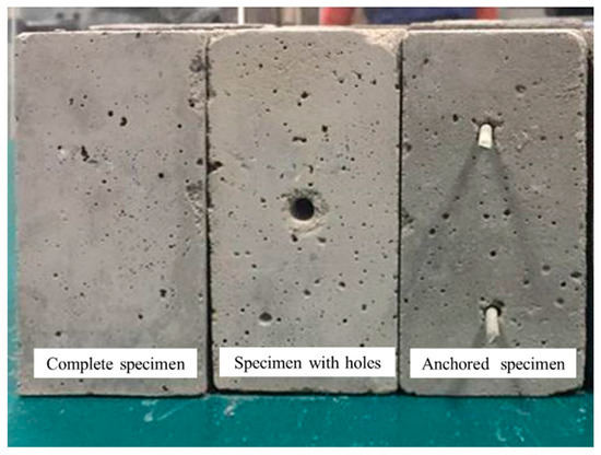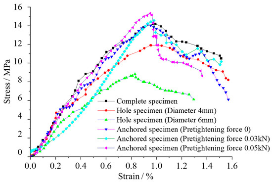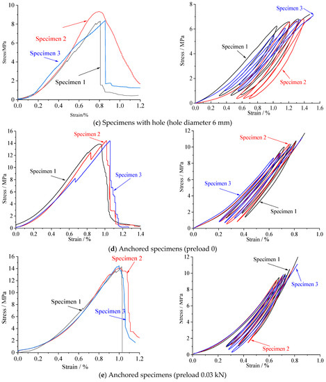 The hole diameters of the fabricated specimens with holes are 4 mm and 6 mm, respectively, and the holes are located in the center of the specimen and crossed the whole specimen in parallel. There are 4 bolts in the anchored specimen, with 2 bolts on two adjacent sides. Magnesium alloy bolts with a diameter of 3 mm were chosen. The bolt tray is an aluminum alloy ring with 3 mm inner diameter and 15 mm outer diameter, and the magnesium alloy bolt was threaded at both ends, and the preload force was applied to the bolt by clamping the bolt tray with nuts, and the preload forces were 0 kN, 0.03 kN and 0.05 kN, respectively.