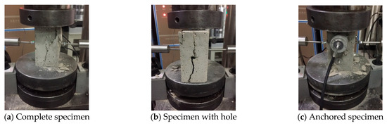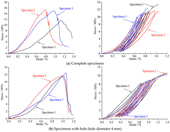 The uniaxial compression tests and uniaxial loading/unloading tests were performed on the specimens in different states to obtain the relevant test parameters. Figure 2 shows the compression tests of the specimens in different forms.