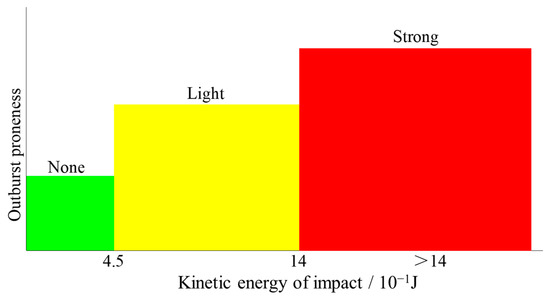 According to Equation (2), the bursting liability of the specimen is graded by using the far-field mass ratio as the standard. And the bursting liability of the specimen is discriminated based on the impact kinetic energy of the crushed block as shown in Figure 6.