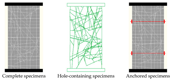 In order to verify the correctness of the bursting liability evaluation method based on the impact kinetic energy of the crushed blocks, a two-dimensional numerical model containing a random nodal mechanism was established using the discrete element software UDEC for simulations to verify the correctness of the evaluation method. The model size is L × H = 60 × 110 m, and the specimen size is L × H = 50 × 100 mm. There is a pressure plate on the top and bottom of the specimen for loading the specimen. The lower platen of the specimen is constrained to be displaced and the specimen is pressurized by the upper platen, which is given a vertical velocity of 0.1 mm/s. And use the Struct Cable command to set the anchor bolts, use the Brick command to set the anchor plate, the anchor plate size is 10 mm ∗ 10 mm ∗ 5 mm, connected to the anchor bolts. The physical mechanical parameters of the rock mass and the mechanical parameters of the joints in the model are shown in Table 8, and the parameters of the anchor bolt are shown in Table 9. and the numerical models established for different states are shown in Figure 7.