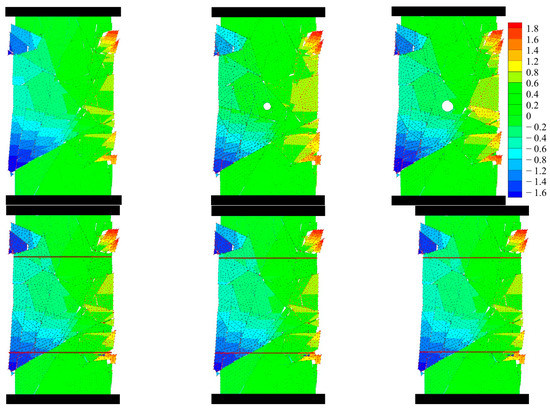 According to the nodal surface contact criterion, tensile damage is considered to occur at the contact surface when the normal stress at the contact surface is zero, while shear damage is considered to occur at the contact surface when the shear stress at the contact surface is greater than the ultimate shear strength. By writing the corresponding program in the built-in Fish language of UDEC, the velocity of the block with tensile and shear damage at the contact surface in the numerical simulation is monitored and the area of the block is calculated, and then the impact kinetic energy of the block is calculated to obtain the impact kinetic energy of the numerically simulated specimen. Figure 9 shows the block velocities of the specimens in different states after the completion of compression.