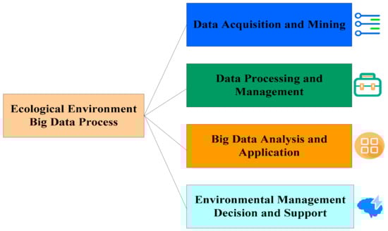 With the development of the Internet and the information industry, big data has become the focus of attention. In the field of ecological environment, due to the complexity of the ecological environment and the difficulty of supervision, it is difficult to deal with big data only by relying on the existing human and material resources [12,13]. The in-depth research and practice of big data has important practical significance for improving the level of environmental protection management and promoting decision support. Data collection is mainly to obtain multi-source heterogeneous spatiotemporal big data with complex sources, complex types, and wide data coverage [14,15]. Single-site data and continuous spatial distribution data provide the possibility for continuous time change monitoring of ecological environment big data [16]. The application level of ecological environment big data is shown in Figure 1.