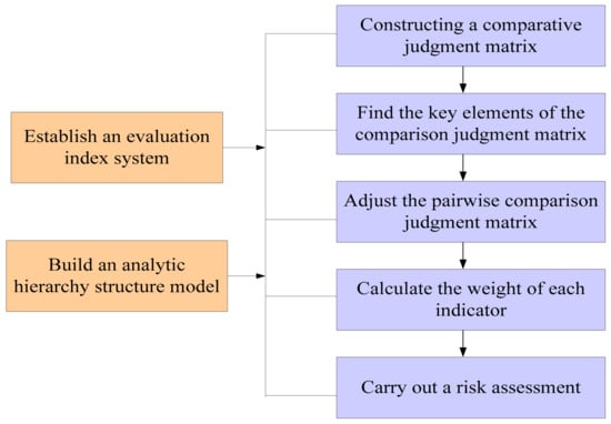 AHP is used to evaluate the economic loss and financial risk of environmental pollution. It establishes an evaluation index system according to the characteristics to be evaluated and analyzes the hierarchical relationship between the established index systems; an AHP structure model is established, and an evaluation table is formulated based on the established index system and AHP structure model to evaluate and judge the importance relationship between each index in each index system. The comprehensive evaluation and judgment results construct a pairwise comparison judgment matrix. The weight of each indicator is calculated through the adjusted pairwise comparison judgment matrix, and the risk is assessed using the determined weight of each indicator and the data in actual operation of the technology. Figure 3 shows the specific steps of using AHP to evaluate the economic loss and financial risk of environmental pollution.