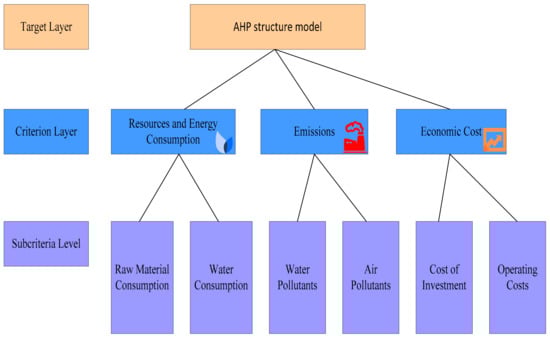 It can be seen from Figure 3 that the index hierarchy model is established by analyzing the steps in the index system. An example of an AHP structure model for environmental pollution economic loss and financial risk assessment is shown in Figure 4.