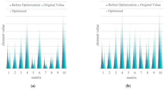 It can be seen from Figure 5a that the values of each element of the judgment matrix calculated by the optimized AHP are relatively consistent with the original values judged by experts. It can be seen from Figure 5b that the values of each element of the judgment matrix and judgment matrix calculated by the AHP before optimization are generally different from the original values judged by experts. That is to say, the element values calculated by the AHP before optimization deviate from the original judgment value, so that the judgment matrix has been adjusted to a certain extent as a whole. In the optimized AHP, except for the values of individual key elements that are adjusted, other calculated values are well consistent with the original judgment values.