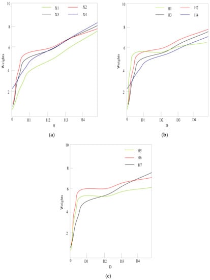 Weight calculation results of judgment matrix , judgment matrix and judgment matrix . (a) Calculation result of judgment matrix ; (b) calculation result of judgment matrix ; (c) calculation result of judgment matrix .