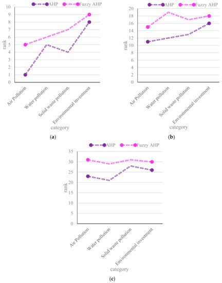It can be seen from Figure 8a that the weights and rankings of most high-risk factors have changed, but they are still in the high-risk range. The impact of air pollution category has been raised from the fifth place of risk in the fuzzy analytic hierarchy process to the first place of risk in the analytic hierarchy process, and this risk is usually ignored. It can be seen from Figure 8b that there is a gap between the risk intensity caused by water pollution in the AHP results and the actual situation. The risk of the water pollution category dropped from the 19th medium risk in the fuzzy analytic hierarchy process to the 12th medium risk in the analytic hierarchy process, which is far from the actual implementation experience. It can be known from Figure 8c that due to economic growth in recent years, the cost control for environmental pollution fluctuates greatly. When estimating risk costs, great attention is paid to the impact of environmental protection investments on project finances. Therefore, the weights and rankings evaluated by the fuzzy analytic hierarchy process are more in line with the actual market conditions.