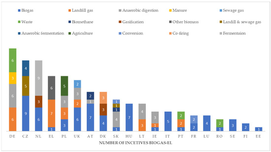 EU Countries—Current number of incentives in EU countries to support biogas in electricity sector. Source: adapted from [44].