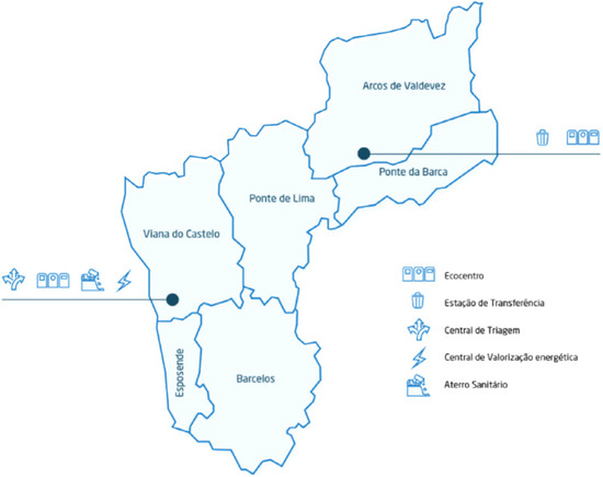 Resulima is responsible for the selective collection of the municipalities of Arcos de Valdevez, Barcelos, Esposende, Ponte da Barca, Ponte de Lima and Viana do Castelo. It is a case of success and sustainability of resources and environmental issues. Established in 1996 by the Portuguese Law 114/96 of 5 August, it is the concessionaire for the management and operation of the multimunicipal system of recovery and treatment of solid waste of the Lima Valley and Lower Cávado. In addition, the construction of the Waste Valorization Unit was completed in 2020, which integrates the Mechanical and Biological Treatment Facility (TMB), the Automated Screening Plant (CTA), the landfill and the Eco-center (Figure 3) [41].