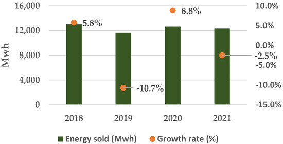 In this regard, the amount of energy recovery from the landfill biogas is fundamental, as it may achieve an export of electricity worth 12,333 MWh. However, regarding this value, it is possible to observe a decrease by 2.5% compared to the same period last year. This decrease results from the prudent reduction of the operating load of the two engines, allowing the production of energy to continue even with the fluctuations in biogas quality caused by reengineering operations and refilling in almost all the surface areas of the cells in the landfill. The graphic in Figure 7 represents the evolution of electricity sales in the last 4 years [45].