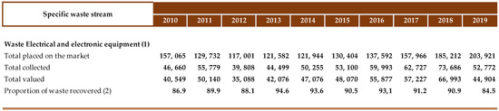 We must continue to strengthen the prevention of the production of EEE waste and encourage its reuse and recycling, promoting full exploitation for a new waste market, as a way to consolidate its recovery and stimulate the use of specific wastes with high potential [18]. At this time in Portugal, prevention programs are being approved and targets are being set for reuse, recycling and other forms of recovery of WEEE; in 2020, 16,702 tons of WEEE was recycled which increased by 2% in 2021.