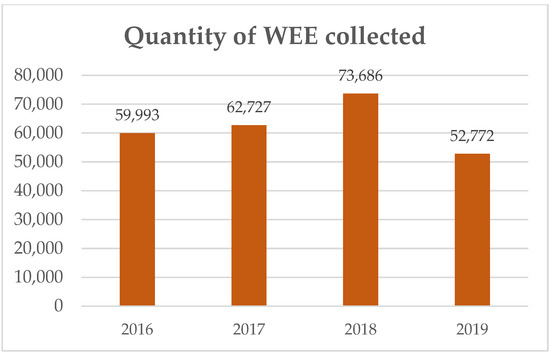 Percentage of WEEE, selectively collected vs. Waste Management Operators Network (WMO). Reprinted/adapted with permission from Ref. [31]. Copyright 2021, copyright ERP.