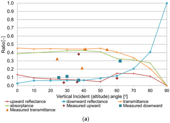 The reflectance, transmittance, and absorptance at each altitude angle are shown in Figure 7. The plots show the measurement results and the plot lines show the calculation results. The different shapes indicate the upward/downward reflected solar radiation, transmitted solar radiation, and absorbed solar radiation. The standard deviations of the measurement results are not overlaid on the figure because they are difficult to decipher, but the maximum and minimum standard deviations were as follows: 0.002–0.013 for upward reflection, 0.001–0.019 for downward reflection, and 0.009–0.083 for transmitted solar radiation. The values of the clear + upward reflective film and clear + film used in the calculations refer to the measurement results of JIS A 1494 by Harima et al. [18,19]. The value of clear refers to the AGC Inc. technical report [24]. The values used in the simulations are presented in Table 2. The measurement points at the time of day (near noon), when the angle between the vertical line of the window and the sun is greater than 60°, are plotted in Figure 7. In other words, these are oblique incidence measurements. In particular, in this case, the measurement error of the amount of solar radiation incident on the solar radiation meter installed parallel to the window surface becomes large, resulting in a deviation from the values measured by the spectrophotometer according to JIS. This suggests that when upward reflective films are introduced on the east and west surfaces, the specular reflection characteristics are strongly expressed during hours close to noon, when the sun enters the building from an oblique direction, and the reflected solar radiation may adversely affect the surrounding space.