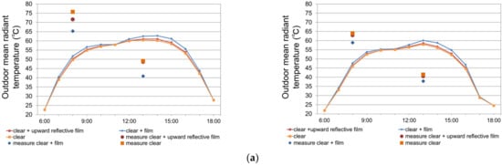 The calculated outdoor mean radiant temperature for each window on 1 September is shown in Figure 14. The human body is exposed to direct solar radiation; therefore, MRT is very high. Outdoors, the effect of direct solar radiation from the lateral direction was dominant, and the MRT was not significantly affected by the difference in the films. MRT is also shown when no direct solar radiation is incident on the human body owing to the parasol. In this case, the MRT depends on the downward reflectance of each window. The downward reflectances of clear + upward reflective, clear + film, and clear at 15:00 were 13%, 21%, and 8%, respectively. The MRT corresponds to the reflectance, and the upward reflective film, which suppresses downward reflected solar radiation, has the same MRT as the single-pane glass, which transmits much of the solar radiation. The calculated and measured outdoor mean radiant temperatures on each window on September 10 and October 6 are shown in Figure 15. The maximum and minimum standard deviations of the measured values, which are not overlaid in the figure due to their complexity, are as follows: the standard deviations of the outdoor MRT on September 10 ranged from 12.2 °C to 15.3° in the morning and from 1.9 °C to 4.6 °C in the afternoon. The standard deviation of outdoor MRT on 6 October ranged from 2.0 °C to 4.8 °C in the morning and from 1.1 °C to 8.7 °C in the afternoon. The standard deviations of the readings in the absence of direct sunlight were all less than 1 °C. In the morning, the influence of a brief changeover between sunny and cloudy conditions caused a large variation in the measurement results, which did not agree with the calculated results. In the afternoon, there are shadows created by surrounding buildings and trees, so the calculated MRT values, which do not consider solar radiation, are not consistent with the measured values. There is no clear qualitative relationship between the observed and calculated values. The measured MRT values in outdoor spaces were calculated using the measured globe temperature, wind speed (measured near the globe sphere), and air temperature, which were affected by local shading and variable wind conditions. In the evaluation by calculation, some results do not match the measurement and calculation because we introduced an assumption to eliminate noise from sources other than the glass surface.