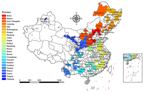 The “National Sustainable Development Plan of Resource-Based Cities (2013–2020)” delineates the scope of China’s resource-based cities, including 116 prefecture-level cities, 8 autonomous prefectures, and 2 prefectures. Among them, the data of Bijie, autonomous prefectures and prefectures are seriously incomplete, and Laiwu was withdrawn in 2019. Therefore, 114 prefecture-level cities in Figure 1 were selected as research objects. Due to the insufficient data for 2020 for variables such as the natural population growth rate, the number of employees, population density, and industrial wastewater discharge, this paper uses the panel data of 114 prefecture-level cities from 2005 to 2019 to comprehensively measure the evaluation index of real human settlements and pseudo human settlements in resource-based cities, and build a coupling coordination model between them.