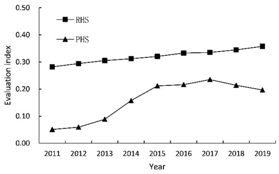 The trend of resource-based cities’ RHS and PHS index.