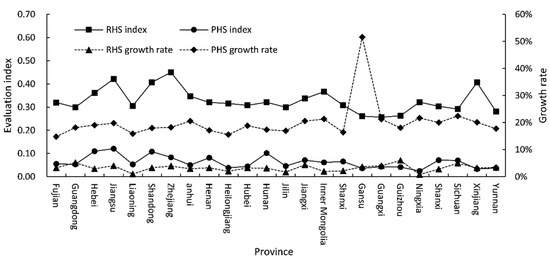 Figure 3 shows that the development quality of RHS in resource-based cities in various provinces is better than PHS, but the average annual growth rate of PHS is much higher than RHS. From the perspective of different regions, the annual average value of the evaluation index of pseudo and real human settlements in the eastern provinces is higher than that in the central and western provinces. The real human settlements environment development quality of resource-based cities in Zhejiang is the highest, and the pseudo settlements environment development quality of resource-based cities in Jiangsu is the highest. Affected by the “One Belt One Road” and “Western Development”, the average growth rate of resource-based cities in the western provinces is significantly higher than the central and eastern provinces. The average growth rate of the real human settlements environment is the highest in Guizhou. Gansu Province has the highest average growth rate of pseudo human settlements environment.