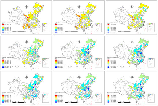 Spatial evolution of coupling coordination degree between RHS and PHS.