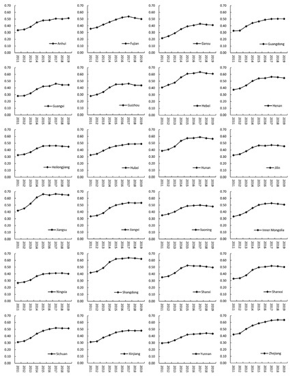 Figure 6 shows the spatial evolution characteristics of the coupling coordination of resource-based city pseudo and real human settlements. Figure 7 shows the changing trend of the coupling coordination degree in each province. The spatial differentiation characteristics of the coupling coordination degree of human settlements in resource-based cities are significant, presenting a three-level ladder-like distribution pattern of east, middle and west. In 2011, the overall coupling coordination degree of resource-based cities was low and in a state of imbalance. Two severely dysfunctional cities, Jinchang and Baiyin, are located in the western region. In 2015, there were two intermediate-level coordination cities in the east, namely Tangshan and Xuzhou, and the coordination level of the cities in the central and western regions improved significantly. In 2017, the coupling coordination degree of all resource-based cities was above 0.3. Cities with mild imbalance were located in the central and western regions. There were 4 cities with intermediate coordination in the east and 2 in the central region. In 2019, the overall level of coupling coordination decreased. Cities with intermediate coordination were all located in the eastern region. The top 20 cities in terms of coupling coordination of human settlements comprised 10 in the east, 7 in the middle, and 3 in the west. The bottom 20 cities are mainly concentrated in Heilongjiang, Yunnan and Gansu.