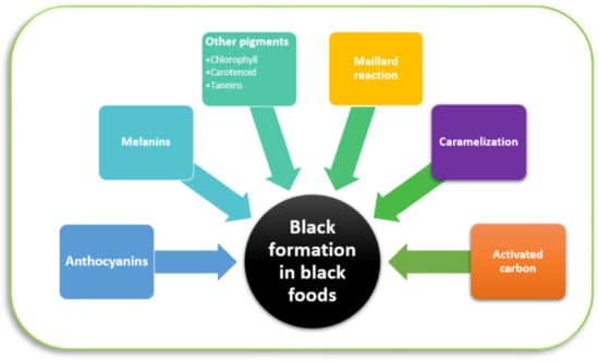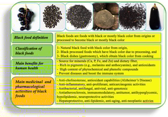 This review attempts to concentrate on listing black foods at present and pigments creating black colors. The database and materials were collected from the most widely used scientific websites including the databases of MDPI, PubMed, SpringerLink, and ScienceDirect, and the specific databases of the European Commission and United States Department of Agriculture (USDA). The information on black foods was collected, analyzed, and listed in tables. All possible black foods were collected and pictures were taken at high resolution, as shown in the figures. The overall knowledge on pigment formation and the health benefits of black foods was elaborated from previous studies with a focus on recent publications.