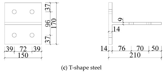M16-type nested one-side bolts were used in this test (Figure 4). The bolt head was connected to the column wall. The bolt sleeve was placed between the bolt hole in the column wall, and the sleeve length did not exceed the column wall thickness. Owing to the sleeve’s large outer diameter, the surface opening diameter for the one-side bolt connection member was 24 mm, and the sleeve length after processing was 9 mm. However, according to the results of a previous study on the mechanical properties of one-side bolts, it is evident that during the proposed static test with cyclic loading, the nut part of the one-side bolts connecting the T-shape steel flange sinks deep into the bolt hole due to the loading process. This causes plastic deformation of the T-shape steel flange in advance, resulting in component failure. Therefore, the opening diameter of the one-side bolt connection to the T-shape steel flange was 17.5 mm. The hole shape for the column wall bolt varied from that of the T-shape steel flange bolt, as revealed in Figure 5. This satisfies the installation requirements of one-side bolts and expands the force area of one-side bolts at the T-shape steel flange.