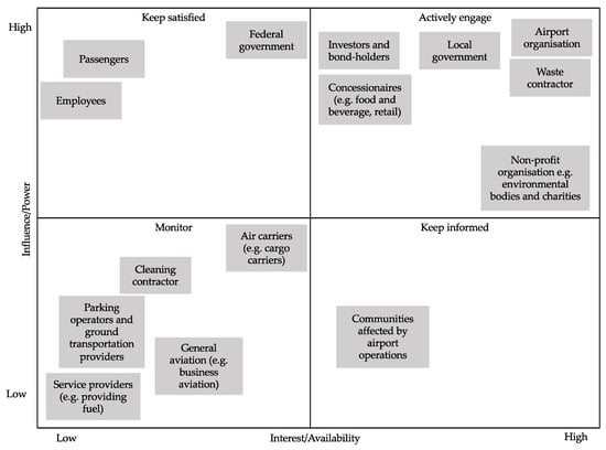 Finally, a lack of stakeholder engagement through an awareness of their roles and responsibilities and active involvement negatively impacts waste management targets. This is because airports host numerous stakeholders who are involved in multiple activities and operations. The stakeholder map in Figure 3 shows the complexity of the conflicting stakeholder values. Whilst passengers may have strong influence or power for impacting waste generation, as mentioned before, they may have low interest or priority to actively engage in responsible waste disposal. However, the government may be interested in introducing policies, such as banning single-use plastics in airports, due to their current political party values, thus giving them more power and influence over waste management change.