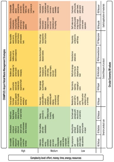 This stage involves analyzing the concepts and best practices to form different design rationales to solve the problems. The concept solution, circular airport retail waste management (CAWM), was influenced by the research surrounding the 9R framework. Rather than providing another top-to-bottom hierarchical framework, such as the 9R framework and the waste management hierarchy, CAWM provides intervention examples for each CE 9R level that can be modified or removed depending on the airport’s needs. CAWM also provides another dimension to the hierarchy by presenting a relative level of complexity, which can be used to assess whether the interventions are viable based on the airport’s budget, time, and resources and the effort required to achieve the intervention.