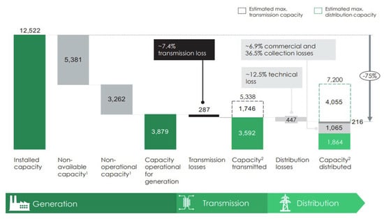 The present total installed capacity of the GENCOs is around 12.5 GW, out of which 5.4 GW is inaccessible and 3.3 GW is nonfunctional, leaving only around 3.9 GW of electricity for the GENCOs to functionally produce and dispatch to the TRACO; 0.3 GW is lost while transmitting to the DISCOs, leaving around 3.6 GW for the DISCOs to distribute to the final consumers; 0.5 GW is lost during distribution so only about 3.1 GW is distributed to the final consumers [6,7]. Figure 1 shows the Nigeria Power Sector energy flow in megawatts (MW). Nigeria’s daily electricity need is approximately 8 GW to 17 GW, although estimating Nigerians’ electricity need is complicated by the passive demand from unavailable electricity [1]. Given that the Nigerian population is over 200 million people [8] and the rule-of-thumb estimates of 1 GW per 1 million people [7], Nigeria will supply the electricity needed to support full industrialization only once the country can produce up to 200 GW of electricity. According to the World Bank, Nigeria’s electricity consumption stands at 144.52 kWh per capita, compared with over 5500 kWh per capita in European countries [9].